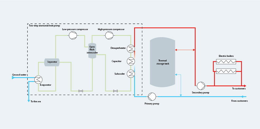 The HOFOR (Greater Copenhagen Utility) district heating in Copenhagen's Nordhavn district was established in 2018 as a demonstration project in EnergyLab Nordhavn, that also supplies three cruise ship terminals and the nearby UNICEF warehouse. The FlexHeat plant comprises a heat pump based on ground water that is retrieved from a 150 m deep well. The saline 10.5°C water is pumped through a heat exchanger with ammonia as a refrigerant. The temperature is raised in two steps via two compressors, and in a heat exchanger, the heat from the condensed ammonia is transferred to the district heating water, which then leads into a storage tank and is pumped out to consumers at the three cruise ship terminals and the UNICEF building. Altogether, the FlexHeat facility has a heating capacity of 1 MW.