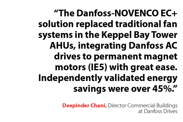 Following a retrofit project implementing the Danfoss EC+ concept for optimal system efficiency — featuring Danfoss AC drives, NOVENCO axial fans, and high efficiency motors — Keppel Bay Tower achieved energy savings of more than 45% in AHU operation, which contributed to making it Singapore’s first BCA Green Mark Platinum Zero Energy commercial building.