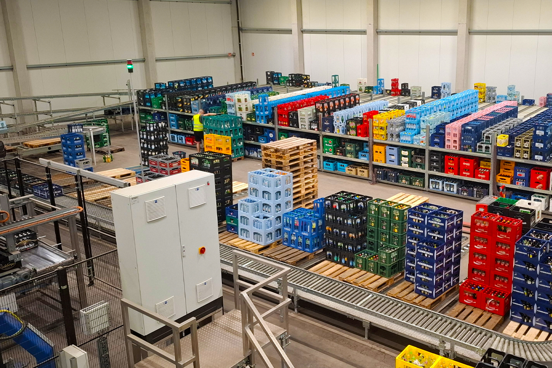When consumers deliver their empties to the return machine, the various crates are stacked unsorted on a pallet. The result is a hodgepodge of different crates and bottles from different manufacturers. Before the empties are returned to the beverage companies, they must be sorted. This intermediate step in the recycling process takes place in DGL's sorting systems for empties.