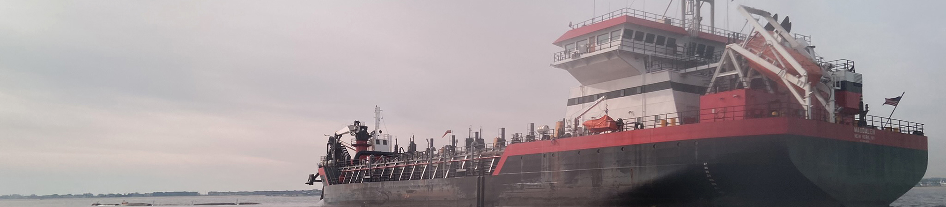 During the dredging process, Magdalen lowers a suction pipe to the bottom of the seabed. The trailing draghead connected to the end of the suction pipe travels over the seabed like a vacuum cleaner’s nozzle. Jetting pumps supply water to the draghead to fluidize the sand being dredged. The centrifugal dredge pump creates vacuum in the suction pipe and discharges the material into the vessel’s hopper. While discharging its cargo load to shore, the centrifugal booster pump makes positive discharge pressure through a long pipeline, preserving slurry velocity and preventing material from clogging the pipe.