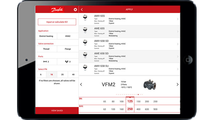 Älypuhelimeen tai tablettiin ladattavalla Danfossin uudella Valve Ruler -sovelluksella voit valita ja yhdistää oikean venttiilin ja toimilaitteen. Voit syöttää tai laskea Kv-arvon syöttämällä tarvittavan virtauksen ja tulo-/lähtöpaineen. Voit myös valita käyttökohteen tyypin sekä määrittää venttiililiitännän, portit ja mitoituspaineen.