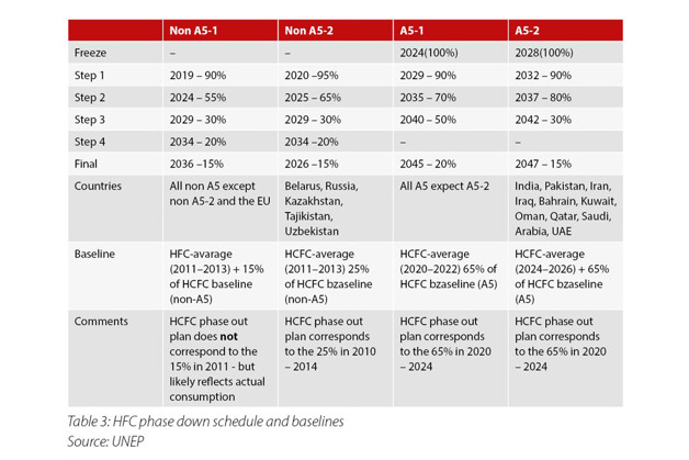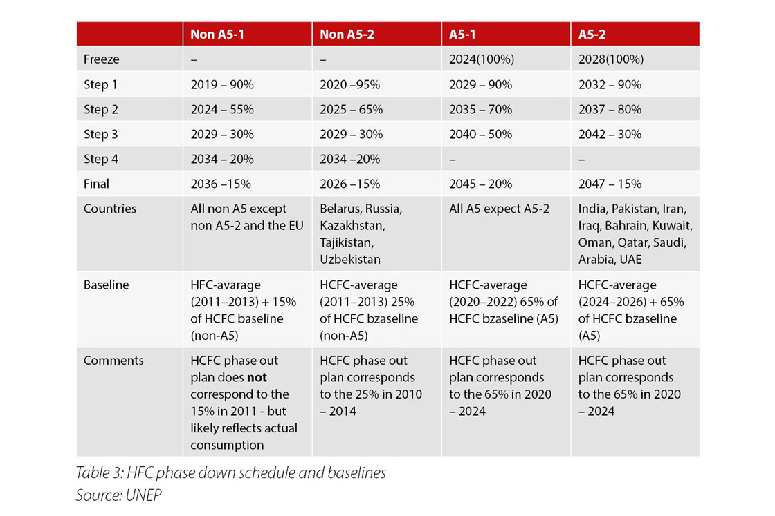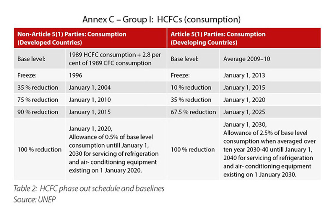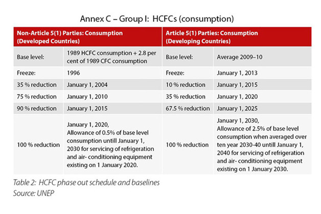 Wraz z włączeniem do Protokołu Montrealskiego w 2016 roku poprawki zakładającej stopniowe wycofywanie HFC na świecie, działania skupiają się na kontrolowaniu dwóch wskaźników: ODP i GWP. Harmonogram wycofywania HCFC przedstawiono w tabeli 2, a harmonogramy stopniowego wycofywania HFC – w tabeli 3. Warto zauważyć, że kraje nienależące do grupy A5 opierają się na wartościach początkowych, które zostały już zamrożone, podczas gdy kraje z grupy A5 opierają się na kontyngentach HCFC (zamrożonych) oraz wykorzystywaniu HFC, które jeszcze nie ma miejsca. W związku z tym pojawiły się pewne spekulacje na temat wprowadzenia w krajach A5 działań zachęcających do wcześniejszego przejścia na czynniki chłodnicze o niskim współczynniku GWP, ponieważ obniżyłoby to wartości początkowe dla tych krajów.