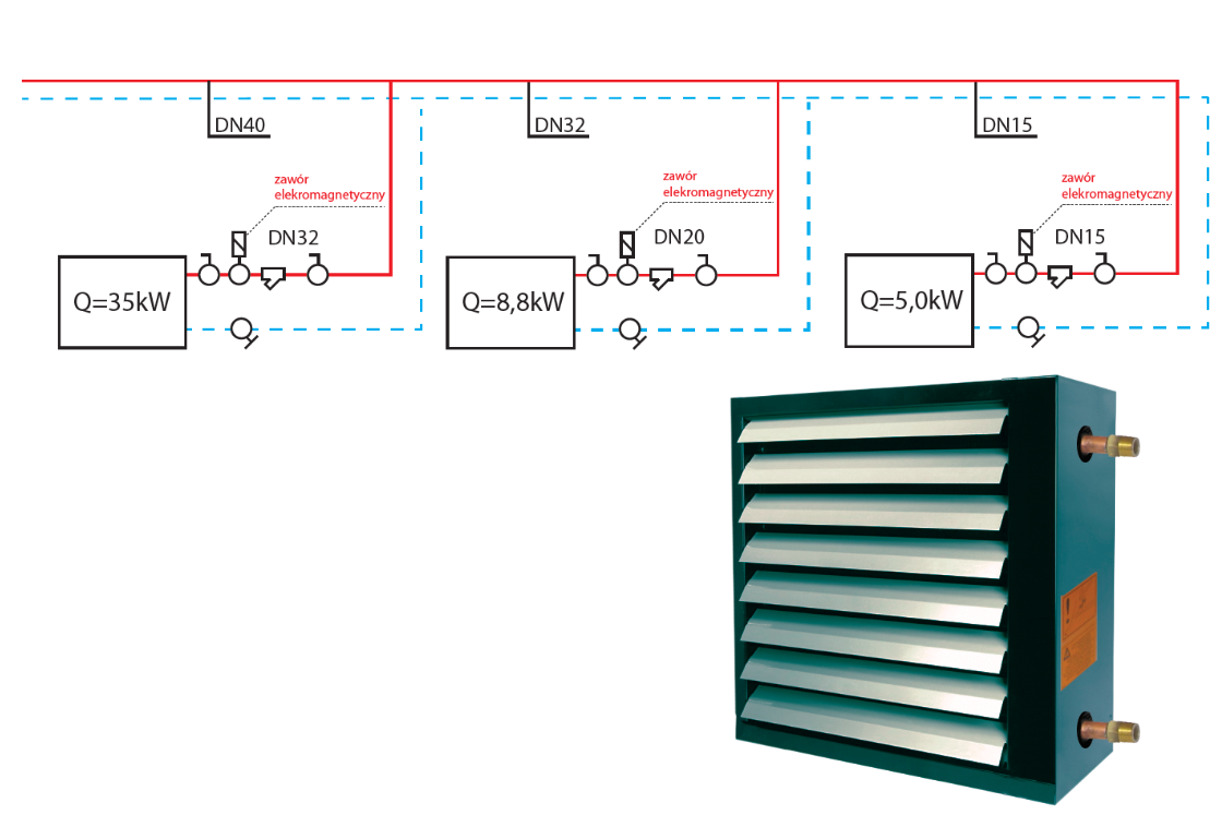 Przykładowy schemat instalacji grzewczej wykorzystujący elektrozawór w nagrzewnicach różnej mocy: